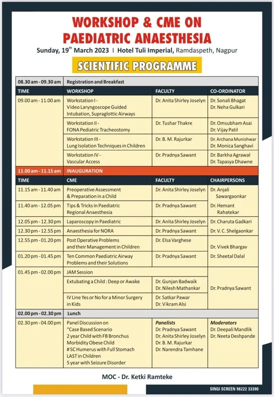 Dr. Vikram Alsi, Dr. Kamlakar Pawar, Dr. Gunjan Badwaik, Dr. Neelesh Mathankar debated on some hot topics in pediatric anaesthesia in the much appreciated JAM session. Dr. Tushar Thakre renowned pediatric surgeon trained the delegates on the surgical airway access during the workshop.