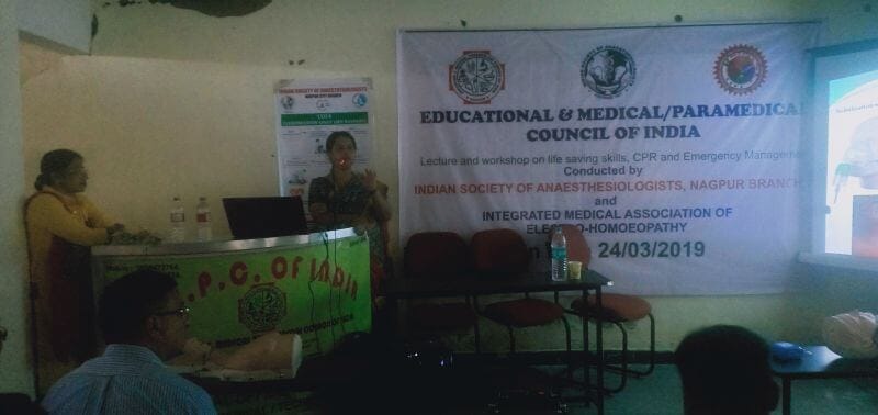 ISA NCB conducted Lecture cum workshop of CPR and emergency management for Practitioners and electro homeopathy students under the aegis of “EDUCATIONAL & MEDICAL/PARAMEDICAL COUNCIL OF INDIA” NAGPUR. Lecture on emergency medical management was taken by Dr. Vrishali Ankalwar and On BCLS by Dr. Umesh Ramtani followed by hands-on demo attended by around 100 delegates. The Jeevan sanjivani CPR charts were given to institute to be displayed in their premises. This was probably the last activity of our tenure .