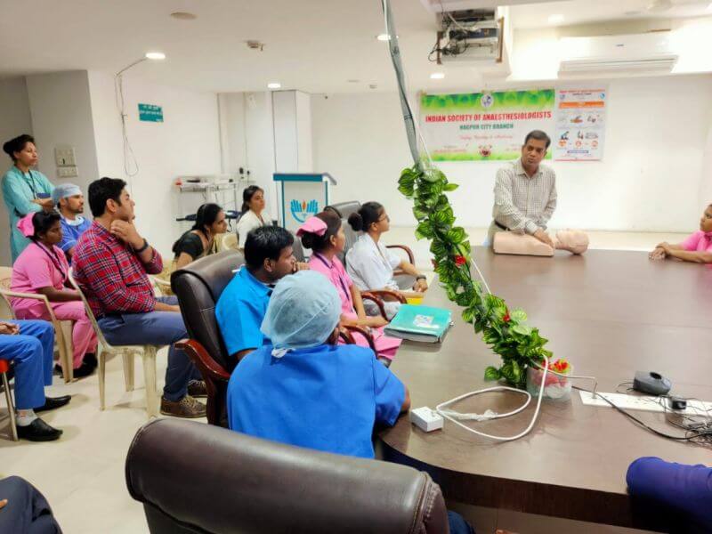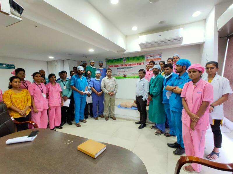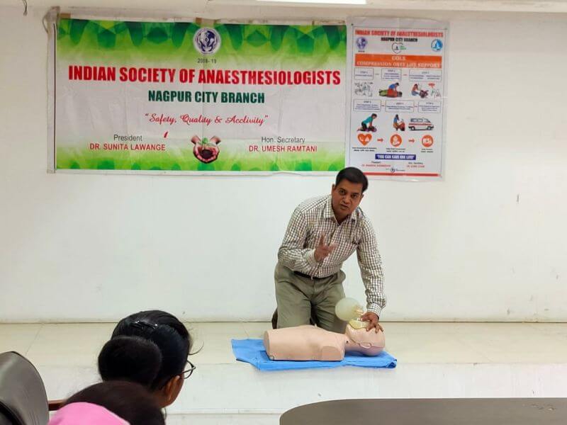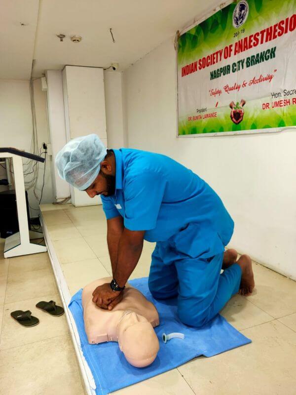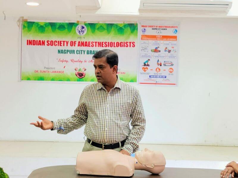 Around 50 people were given hands on training on mannikin. The lecture was delivered and demonstration given by Dr. Deepak Madankar, Hon. Treasurer, ISA NCB & Consultant Anaesthesiologist.