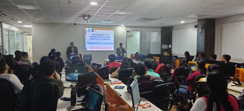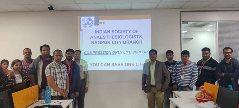 The training program was conducted by Dr Deepak Madankar, Hon. Treasurer, ISA NCB, 2019-20 & Dr. Neelesh Mathankar, Consultant Anaesthesiologist, Nagpur. Program was attended by around 80 IT Engineers and Professionals. PPT presentation of COLS was given after which hands on training on mannequin was imparted to all the participants and queries regarding CPR which were answered.