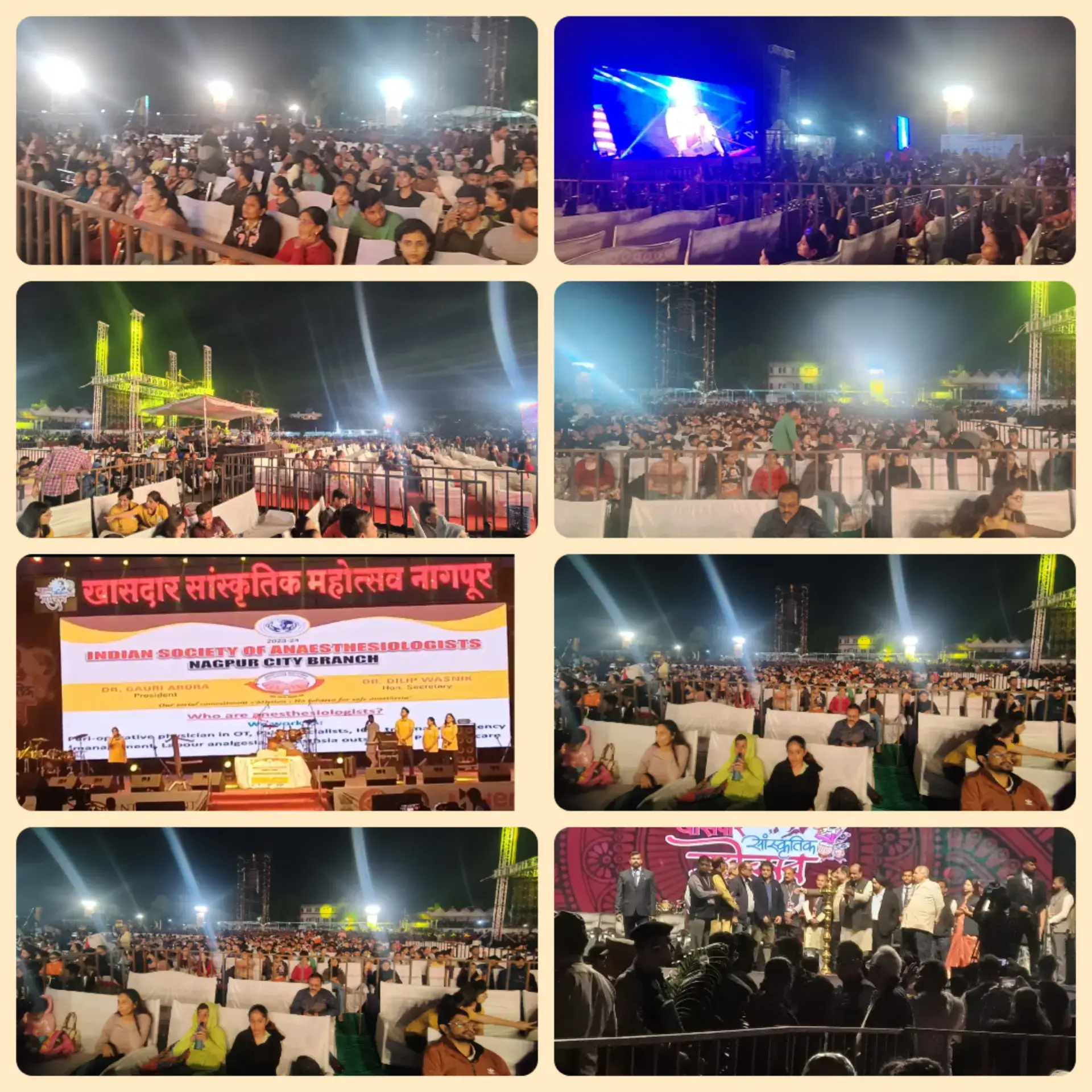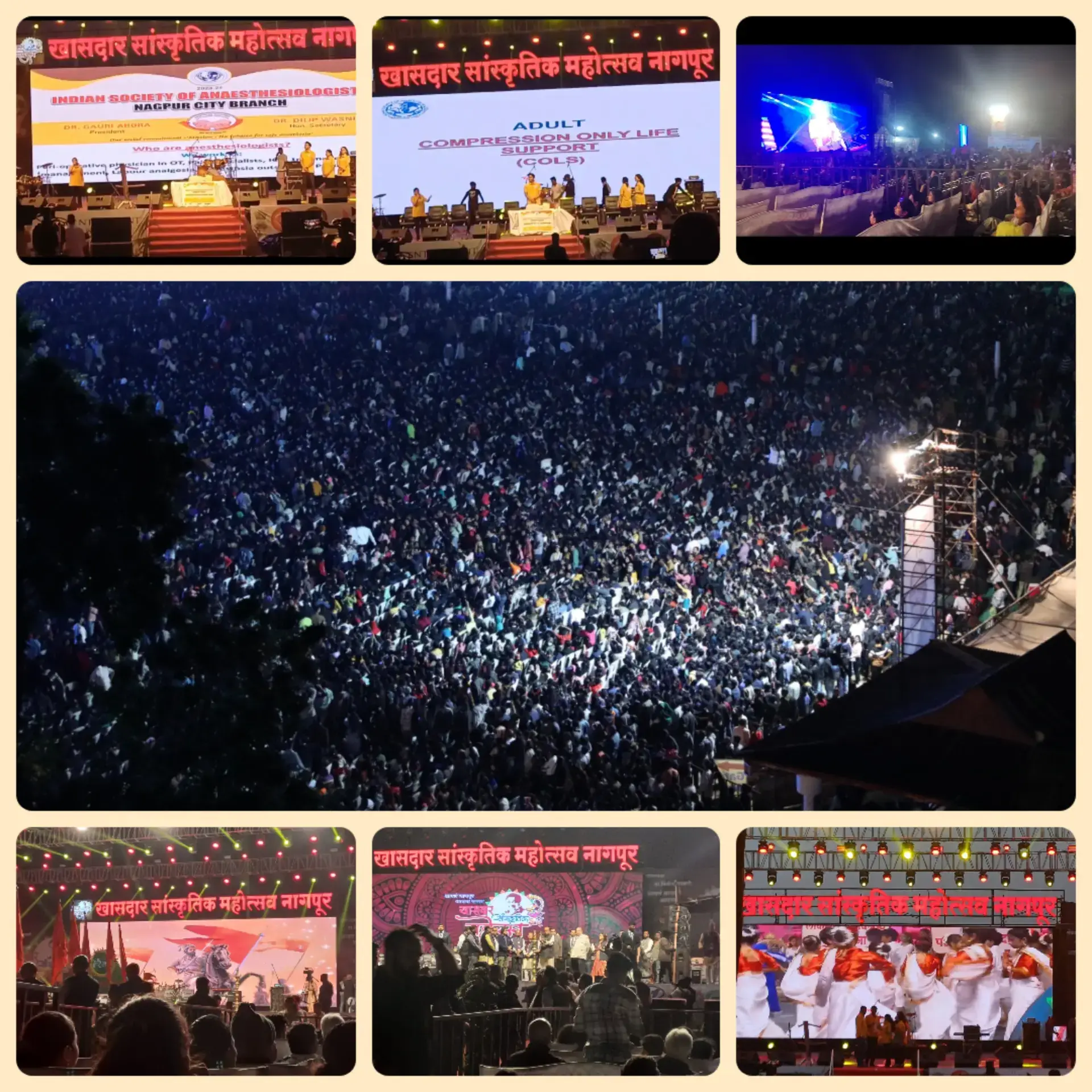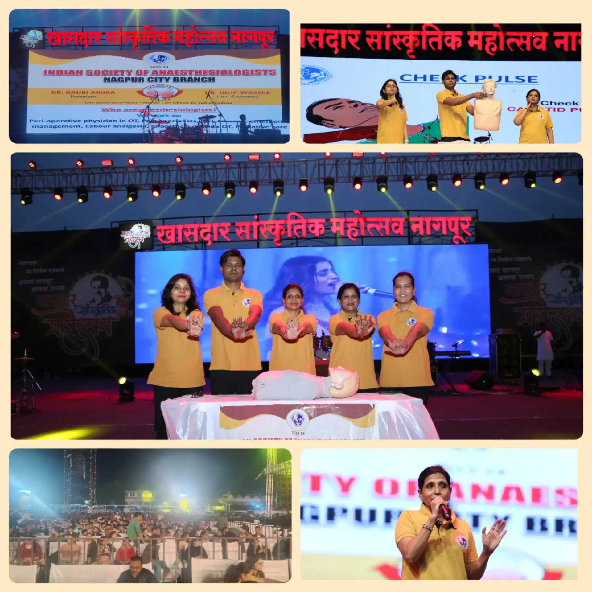 It’s a matter of great pride and honour that ISA Nagpur City Branch was given a platform for demonstration of Compression only life support ( COLS) and creating public awareness at Khaasdar Sanskrutik Mahotsav, Nagpur which is a 12 day long gala event which is a concept by Hon Minister Shri Nitinji Gadkari and it’s includes various cultural program and many performances by celebrity singers and bollywood actors. Dr Gauri Arora President ISA NCB started the lecture with the introduction about…Who is Anaesthesiologist? and their role inside and outside OT, as Intensivists, Pain Physician etc. She added how Anaesthesiologist played their crucial role during COVID pandemic.