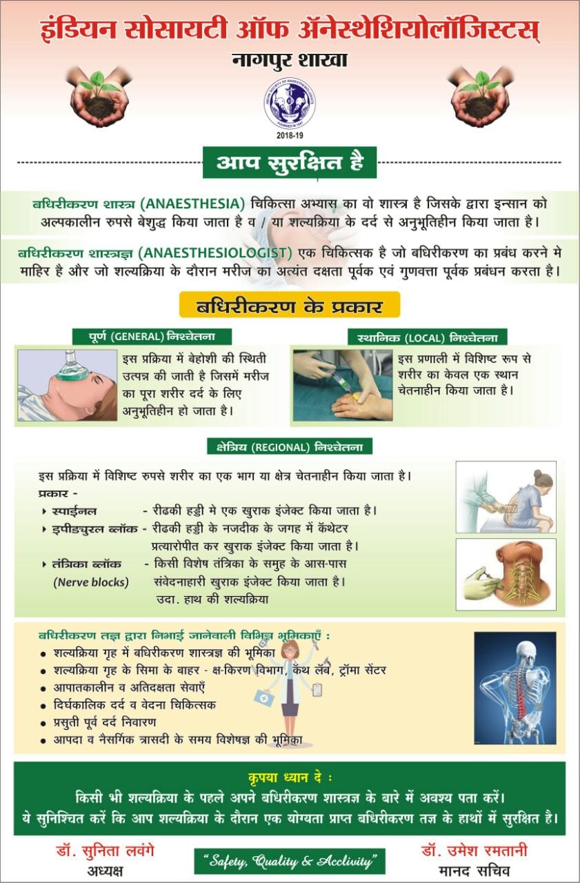 YOU ARE IN SAFE HANDS is slogan of anaesthesia awareness charts depicting importance of anaesthesiologist and role of anaesthesiologist in various fields of Medicine. We are going to donate these charts at nursing homes, corporate hospitals and Government medical colleges all over the region to be put in waiting rooms, OPDs and operation theatres . These charts are made in English, Hindi and Marathi for better understanding.