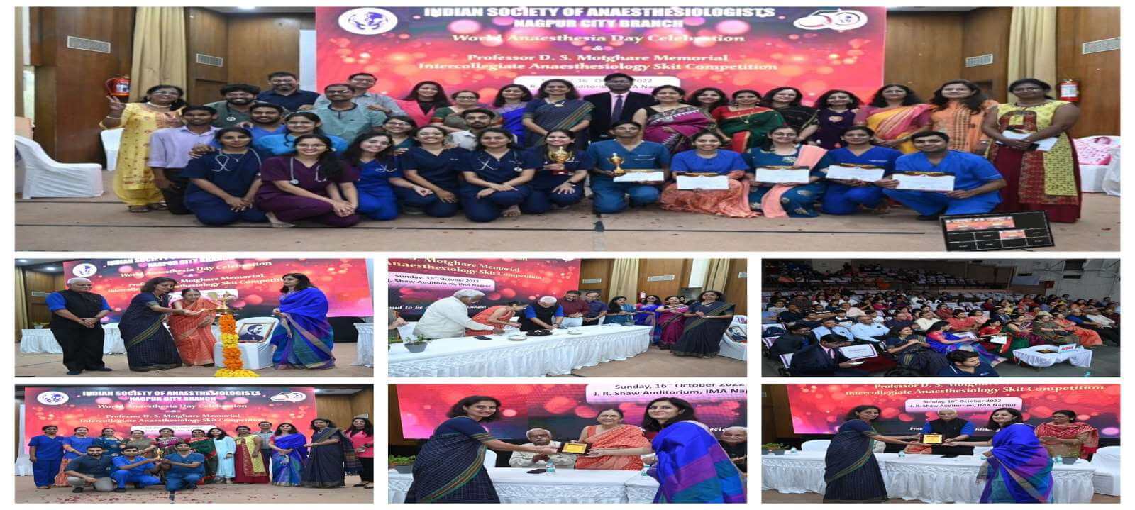 World Anaesthesia day is every year celebrated with much enthusiasm and zeal by ISA NCB . This year also members all over the city gathered for the celebration , with DR. Raj Gajbiye, Dean, Govt . Medical college, Nagpur being the chief guest and Dr. Anjali Bhure ,Vice president ISA National the esteemed Guest of honour. ISA NCB patron Dr. Hema Mankeshwar madam and seniors attended the function. The program included the auspicious lighting of samai along with cake cutting and pearls of wisdom from the guest speakers. The programme marked the starting of Prof. D S Motghare Memorial intercollegiate anaesthesiology skit competition, with 6 teams from Govt. Medical college Nagpur, IGGMC Nagpur, NKP Salve Medical college, Nagpur, AIIMS Nagpur, Shalinitai Meghe Medical college Nagpur and JNMC, Sawangi, participated in it. Any one from p g to HODept could participate. The competition was judged by Dr. Gauri Arora consultant anaesthesiologist and Dr. Sunita Lawange consultant anesthesia and pain . The winners of the competition were the team from IGGMC, Nagpur and the runners up were the team from Shalinitai Meghe Medical College . ISA NCB felicitated the meritorious wards of the members and the achievements of the members at various State , national and international level . The official release of e sense was done during the program with the theme of Anaesthesia ‘KAL AAJ AUR KAL’ the chief editor was Dr . Umesh Ramtani , and the authors and the topics for e sense were : Dr . Soma Cham asso . Prof sst