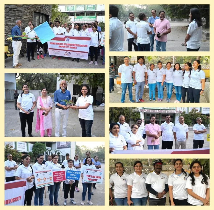 Prof. P M Padole with his better half Mrs. Pallavi Padole, flagged off the walkathon from the start point of Tirpude college of management. All the members walked for the cause of Anaesthesia awareness with banners and slogan placards in their hands.