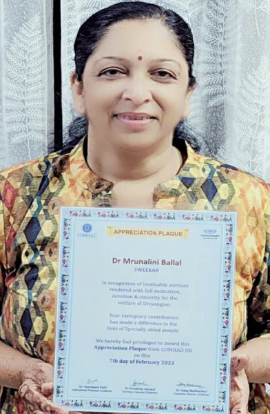 Dr. Mrinalini Ballal senior ISA NCB member received a special appreciation certificate from COMHAD UK for her work with Specially abled persons.