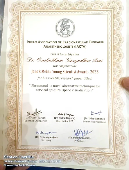 Happy to share that Dr OmShubham Asai, Asst Prof, Dept of Anaesthesiology & Critical Care, AIIMS Nagpur received the prestigious Janak Mehta Young Scientist Award, at IACTACON 2023, Jodhpur.