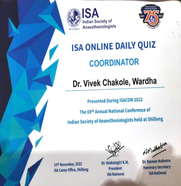 Dr. Vivek Chakole Prof. and HOD JNMC Sawangi Wardha, received certificate and a token of appreciation at the 69 th Annual Conference of ISA at Shillong for coordinating the daily online quiz.
